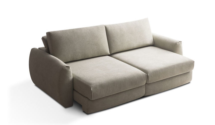 - Encosto com almofada solta em fibra siliconada, revestida por manta de fibra. Encosto com catraca de 5 estágios. Profundidade do assento retrátil aberto: 1,65m.
